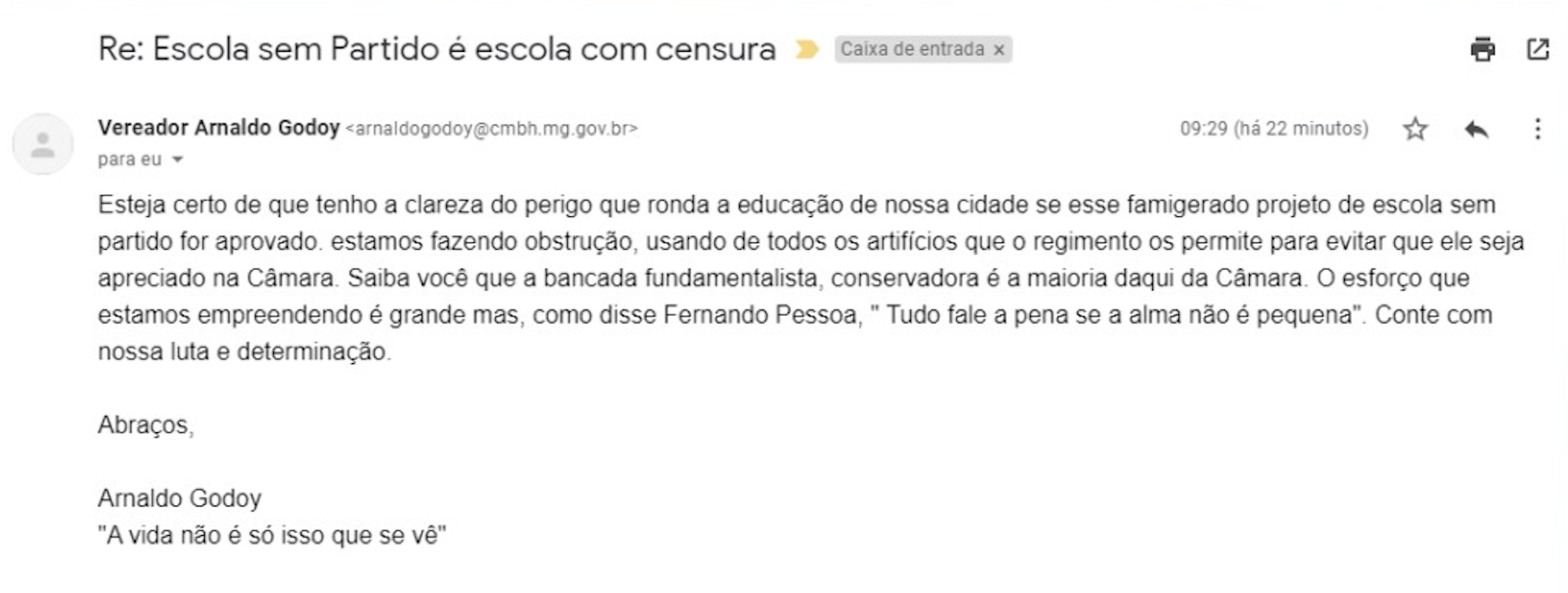 Quando um vereador responde publicamente nossa pressão dizendo que votará contra o Escola Sem Partido, tiramos ele da lista de alvos da campanha.